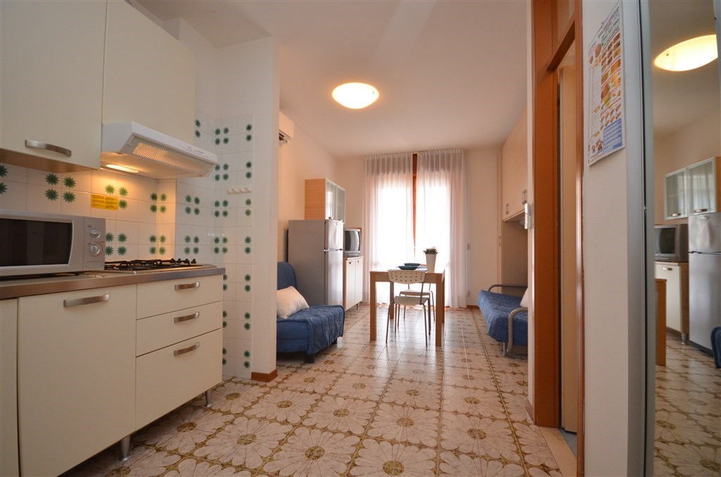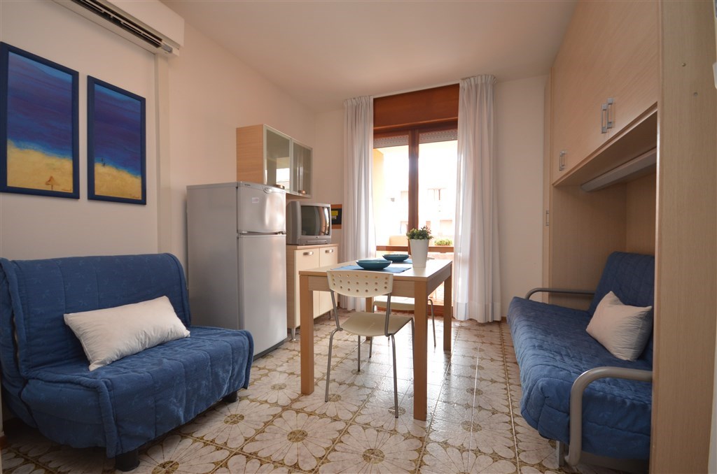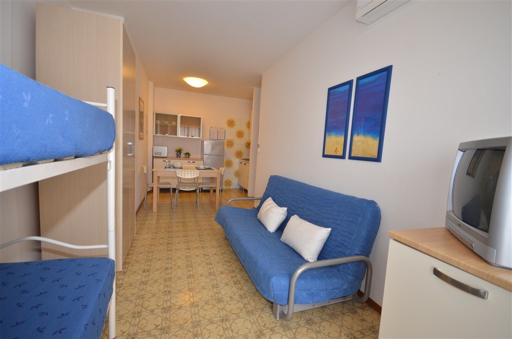 Mono 3/4 - obývací pokoj s kuchyňským koutem, rozkládacím gaučem pro 2 osoby (možno i typ "šuplík") a rozkládacím gaučem pro 1 či 2 osoby či palandou, sociální zařízení se sprchovým boxem, balkon