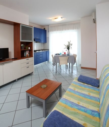 Trilo 6 - 1 ložnice s manželskou postelí, 1 ložnice se dvěma oddělenými lůžky, obývací pokoj s kuchyňským koutem a rozkládacím gaučem pro 2 osoby, sociální zařízení, terasa.