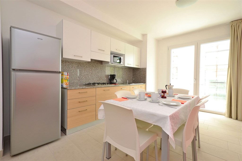 moderní apartmány • sprcha/WC • TV • fén • kávovar • klimatizace • balón/terasa • app BILO - pro 4-5 osob, ložnice, obývací pokoj s rozkládacím gaučem, kuchyňský kout • app TRILO - pro 6-7 osob, ložnoce, pokoj s oddělenými lůžky (možnost palandy), obývací pokoj s rozkládacím gaučem, kuchyňský kout